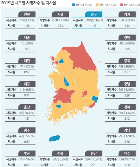 공단은 도 지역에서 경기(1.14)를 제외한 모든 도의 치사율이 전국 평균(1.46)보다 높았고 특히 충남(3.28)과 전북(3.13)의 치사율은 전국 평균보다 2배 높았다고 설명했다.