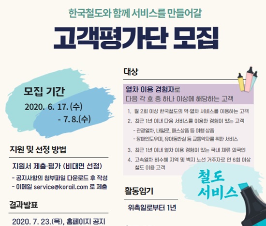 고객평가단 공모기간은 오는 17일부터 다음달 8일까지다. 지원을 희망하는 사람은 한국철도 홈페이지(www.letskorail.com) 공지사항을 참고해 신청서를 이메일([email protected])로 접수하면 된다.
