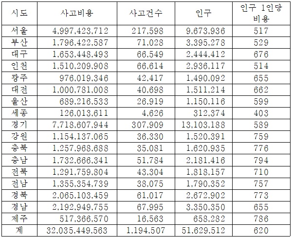 그러나 인구당 도로교통사고 비용은 충남이 79만4000원으로 가장 높았다. 이어 제주(78만6000원), 충북(77만6000원) 순이었다. 세종은 40만3000원으로 가장 낮았다.