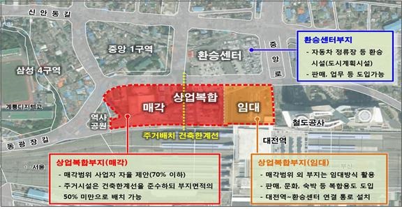 또 철도(KTX·일반열차)와 대전지하철, 세종~대전 간선급행버스(BRT)가 오가는 복합환승센터 계획도 포함돼 있다. 환승센터는 한국철도와 대전시가 공동 개발하지만, 민간사업자도 상업복합부지와 통합 개발을 제안할 수 있도록 했다.