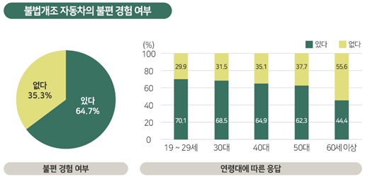 불법개조 자동차의 단속 필요 여부에 대해선 응답자의 92.3%(936명)가 강력한 단속이 필요하다고 답했다. 이 가운데 불편을 느낀 적이 없지만 단속이 필요하다고 응답한 비율도 29.1%(295명)에 달했다.