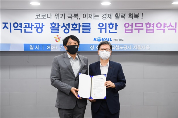 한국철도(코레일)와 한국관광공사는 2일 한국철도 서울사옥에서 신종 코로나바이러스 감염증(코로나19)로 침체된 국내 관광시장 활성화를 위해 업무협약(MOU)을 맺었다고 밝혔다.