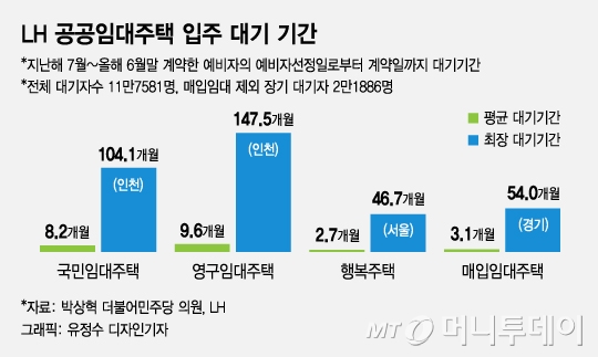 6일 국회 국토교통위원회 소속 박상혁 더불어민주당 의원이 LH(한국토지주택공사)로부터 받은 'LH 임대주택 대기자 현황'에 따르면 올해 6월말 기준 최근 1년간 국민임대주택, 영구임대주택, 행복주택, 매입임대주택 등 임대주택 입주 계약을 맺은 사람들 중 예비자 선정일로부터 계약일까지 대기 기간이 가장 긴 사람은 인천 거주 영구임대 예비자였다. 147.5개월(12.3년)이나 기다렸다.