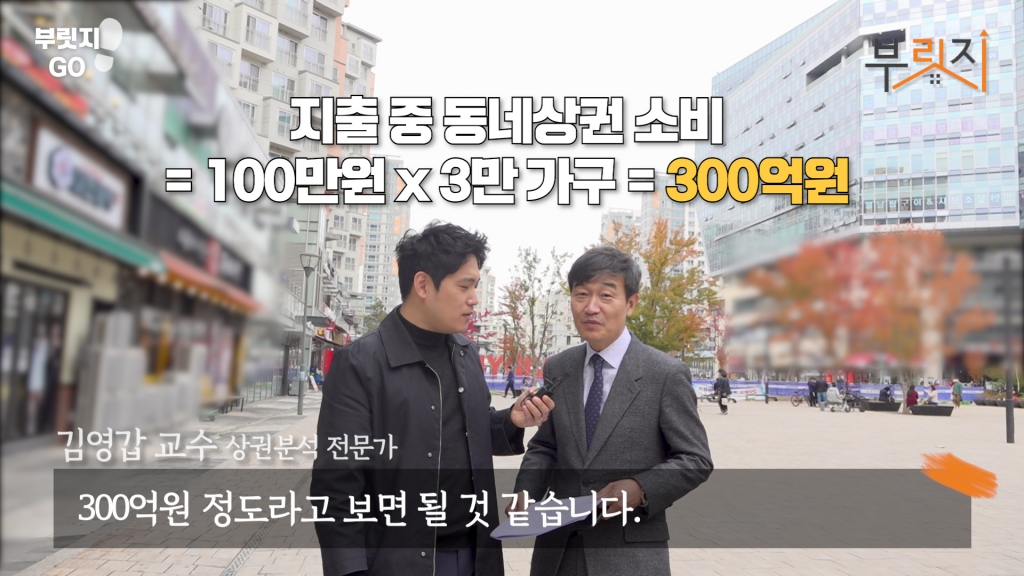 그러면 어느 정도 많은지 알아볼게요. 제가 헬리오시티 때도 설명해 드렸는데 여기가 지금 3만 가구죠. 가구당 소비하고 지출하는 금액은 월평균 300만원 인데요. 3만 가구가 산다고 하면 900억원이죠. 이 금액 중 지역상권에서 쓰는 게 30%라고 보면 300억원이 조금 안 되죠.