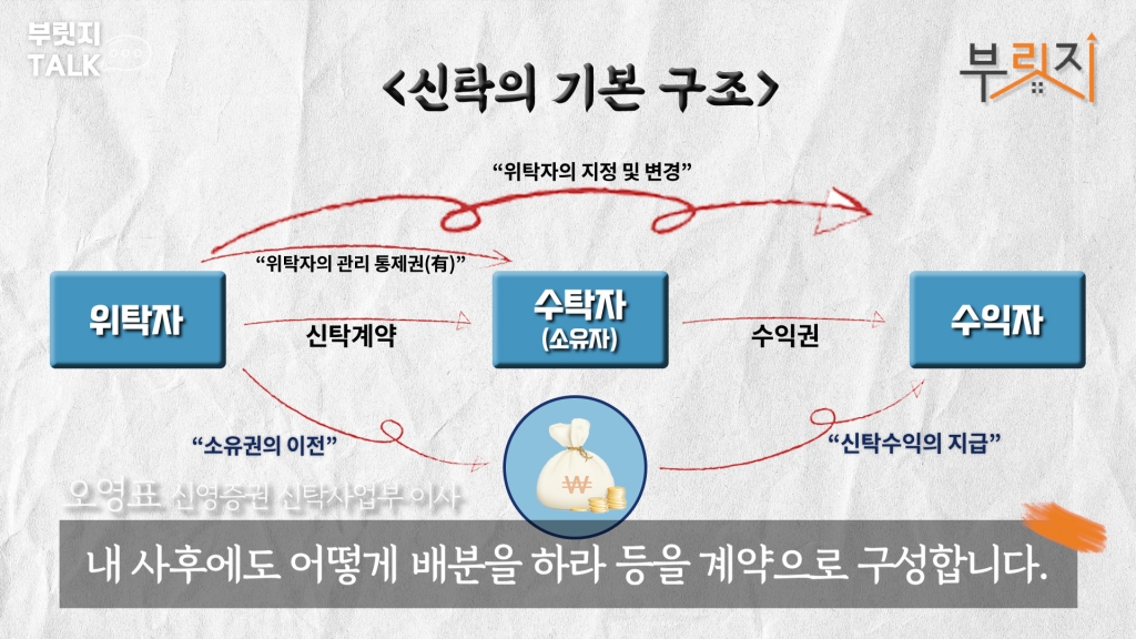 쉽게 얘기하면 재산관리하는 도구인데요, 신탁은 소유권을 넘겨놓고 관리한다고 볼 수 있어요. 소유권을 넘겨받는 사람이 수탁자, 저희 같은 신탁회사가 되는 것이고요. 신탁회사에 자산을 넘겨 놓고 원하는 대로 운용하고 관리하고 사후에 어떻게 배분하라 는 것들을 계약으로 구성합니다. 이게 신탁계약이에요.