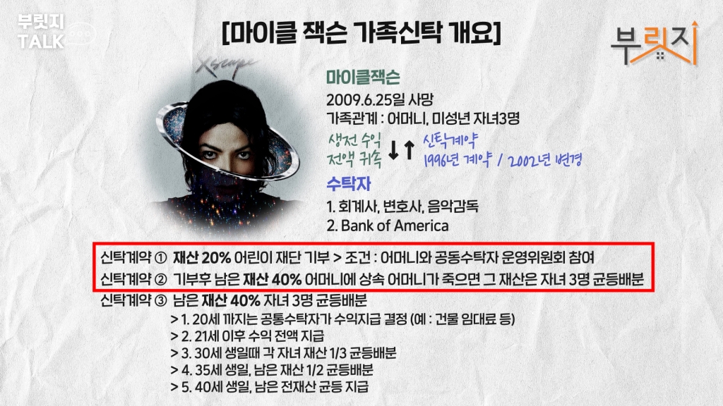 마이클잭슨은 유언대용 신탁, 리빙 트러스트가 공개됐어요. 원문을 봤는데요. 어린 미성년 자녀 3명 그리고 당시 79세 노모가 있었죠. 그래서 미성년 자녀를 위한 신탁과 엄마를 위한 신탁을 만들어 놨죠.