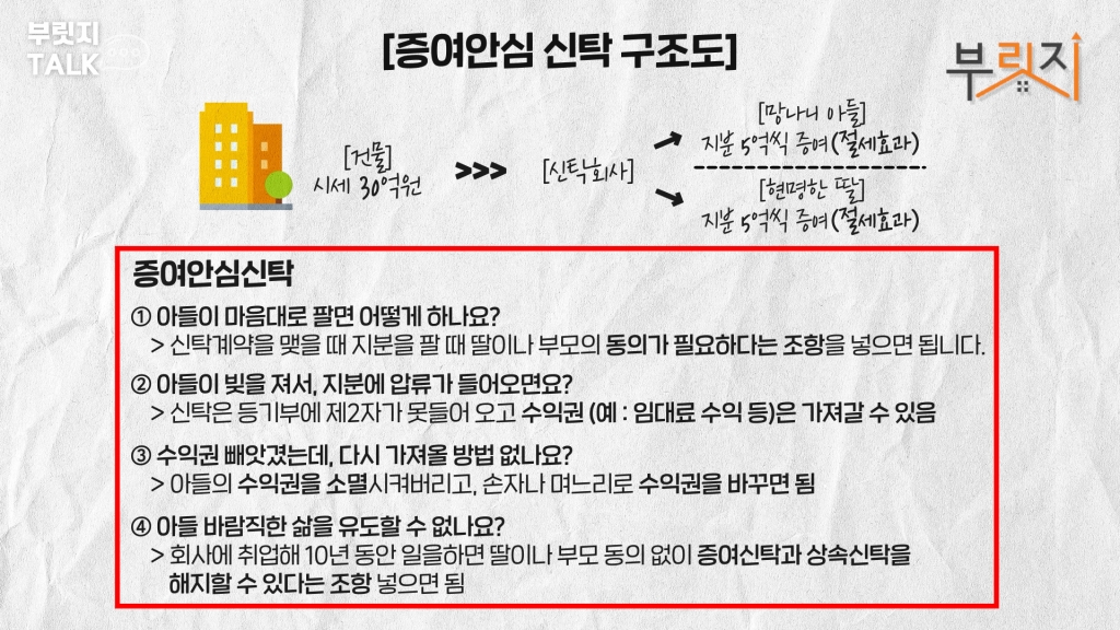 절세를 먼저 하고 신탁을 씌워 아들이 함부러 팔지 못하게 하는 거죠. 채권을 아버지가 행사할 수 있는 거죠.