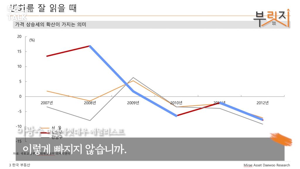 이해하셨어요? 왜 그런지? 마지막 수요가 떠밀려서 사는 곳이 이런 지역이란 말입니다. 대출이 가능하거나 내가 살 여력이 되는 지역으로 밀려나서 산 단 말이에요. 그런 현상이 나타나는 게 전형적으로 시장이 고점 시그널이라니깐요. 2007년도에 노원구가 제일 많이 올랐다가 이렇게 빠지지 않습니까.