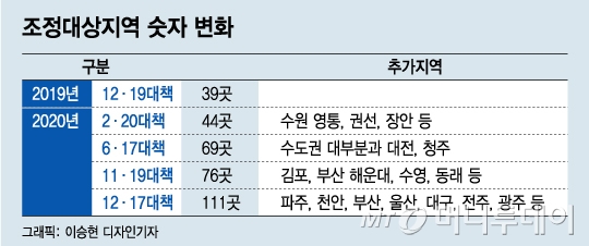 정부는 지난 17일 36곳을 조정대상지역으로 추가 지정하며 강원도와 제주도를 제외한 전국 총 111곳을 조정대상지역으로 지정했다. 하지만 이렇게 대거 지정하기까지 정부는 뜸을 들였다. 앞서 지난달 20일 경기도 김포, 부산 해운대·수영‧동래‧연제‧남구, 대구 수성구 등 7곳을 조정대상지역으로 지정하면서 집값이 급등했던 울산과 창원은 조정대상지역에서 제외했다.