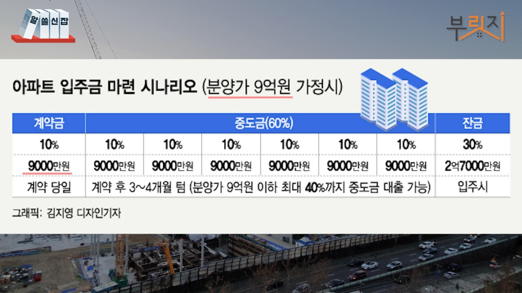 사실 내 집 마련을 꿈꾸는 분들이라면 청약에 당첨되더라도 입주금을 마련하는 것이 문제입니다. 당첨되면 통상 분양가의 10%가량 계약금을 내야하고 이후 3개월 뒤부터 3~4개월마다 중도금 10%씩 총 60%와 입주할때 잔금 30%를 내야 합니다. 분양가가 9억원이라면 계약금으로 9000만원을 마련해야 합니다.