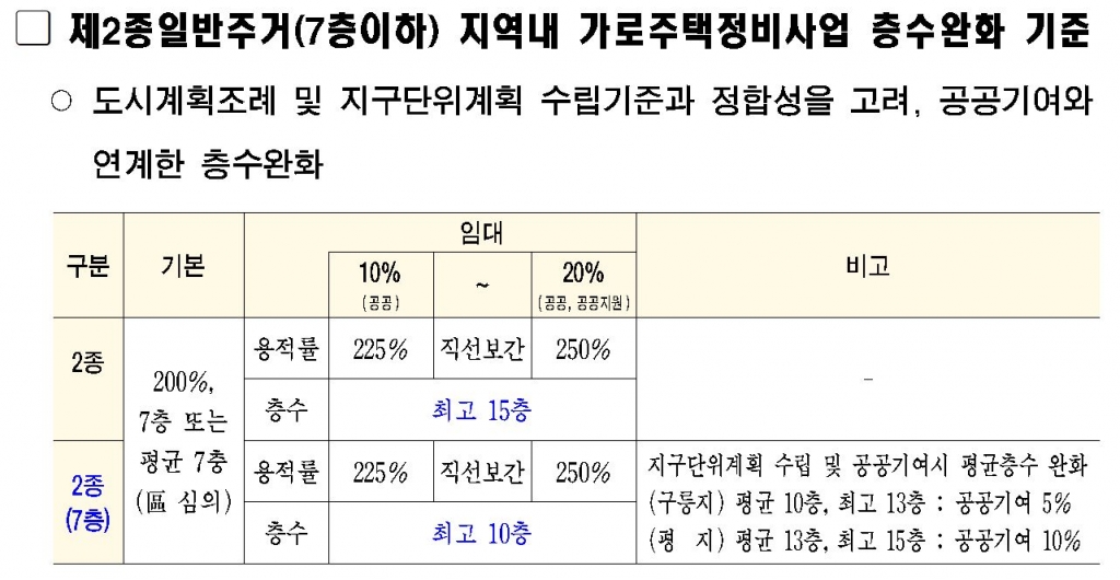 서울시 관계자는 "층수 제한이 없는 제2종일반주거지역은 공공임대를 지어서 15층까지 높일 수 있지만 제2종일반주거지역(7층 이하)에서는 층수 규정이 있기 때문에 공공임대를 넣는다고 해도 법적상한 용적률 250%를 다 찾아서 건물을 짓기가 사실상 어려웠다"고 말했다.