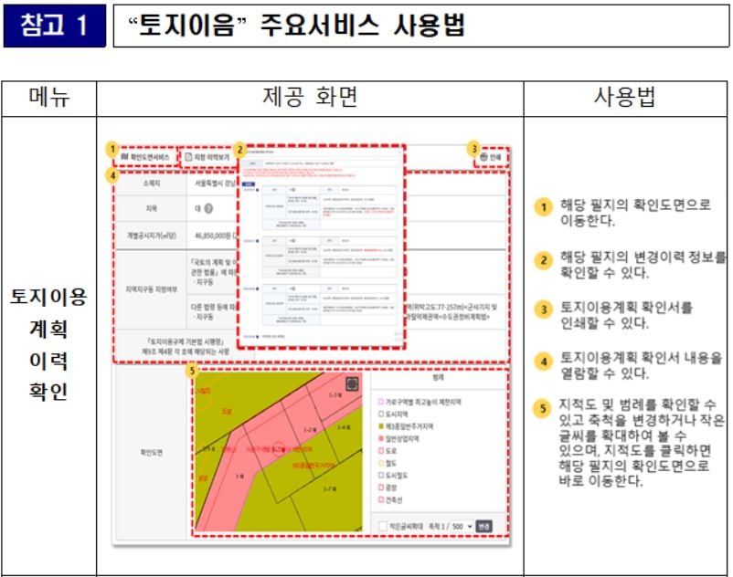지금까지는 현재 토지이용계획만 제공했지만 지번별 지역·지구의 지정 및 해제 이력, 필지의 분할·합병 등 토지이동 정보도 함께 볼 수 있게 된다.