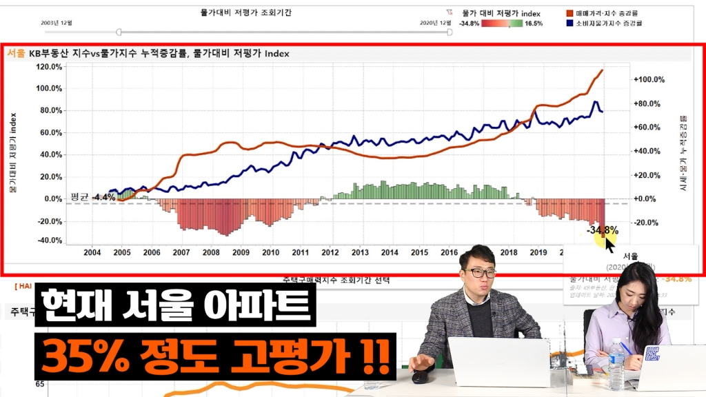 반면 2013~2014년 이때가 가장 저평가됐고요. 2018년 중순부터 고평가로 접어들었고요. 그리고 지금은 -34.8%입니다. 즉 물가 대비에서 서울 아파트값이 지금 35% 정도 가량 고평가됐다. 이 수치는 역사적으로 봤을 때 가장 높습니다. 2008년 이때보다 더 심각해요.