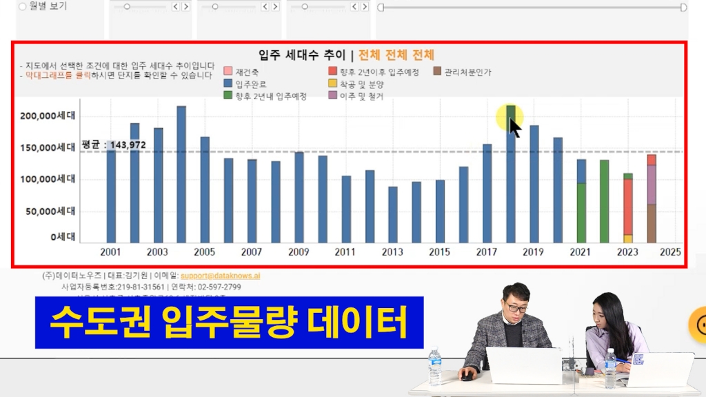 실제 데이터를 가지고 보여드릴게요. 전국 입주 물량 데이터에요. 입주 물량이 평균보다 살짝 적지만 많이 적지 않죠? 수도권만 따로 떼서 볼게요. 2017년~2019년 입주 물량 많았죠? 이때 신문 기사에서 가장 많이 나왔던 말이 '수도권 입주 폭탄' '아파트 가격 올라가기 힘들다'였어요. 정부가 2017년 8·2대책을 통해서 본격적으로 규제에 나선 데다 입주 폭탄이 있어서 부동산 전문가의 80%가 집값이 못 올라간다고 했어요. 그런데 저는 '무슨 소리냐, 지금 (집값은) 굉장히 저평가 돼 있고 입주 물량이 있어도 (집값은) 올라간다'고 주장했어요.