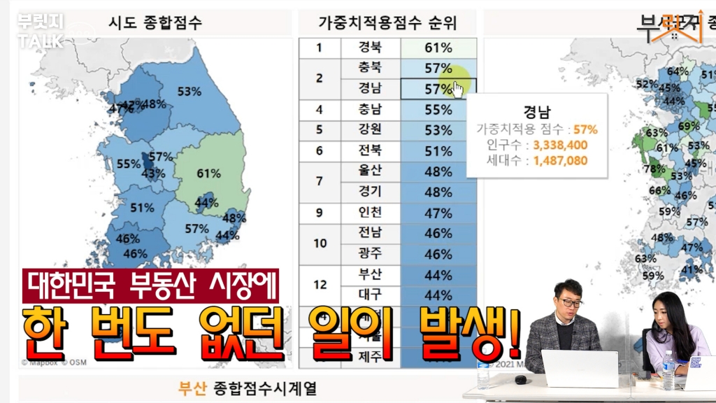 중요한 건 지금이겠죠. 그런데 녹색인 지역이 있어요, 없어요? 없죠. 그동안 한 번도 없던 일이 나타난 겁니다. 전부 다 파랗죠. 앞선 2008년, 2014년, 2017년 말에는 녹색인 지역들이 있었는데 지금은 하나도 없어요. 그나마 경북, 충북, 경남, 충남 이런 데가 상대적으로 양호하고요. 여기도 점수가 썩 좋지 않아요. 제주, 서울, 대전 등은 데이터가 굉장히 안 좋아요. 구체적인 지역으로 놓고 봤을 때는 어떤가요. 이런 곳들은 그나마 사도 괜찮겠죠. 지금 시점에서 사도 괜찮은 지역이 어디인지에 관한 자료는 부릿지 구독자분들께 따로 공유하는 것으로 하겠습니다.