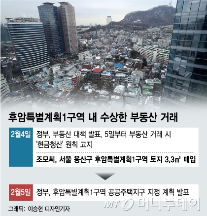 후암1구역은 부동산 대책이 나온 다음날인 5일 정부가 공공주택사업을 추진한다고 발표한 곳이다. 정부의 정비 사업계획이 발표되기 하루 전에 부동산 거래가 이뤄지면서, 후암1구역 관련 정보도 중간에 샌 것 아니냐는 의혹이 나온다. 후암1구역 주민들은 정보 유출 여부를 조사해 달라며 감사원에 감사를 청구할 계획이다.
