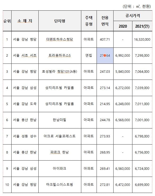 1위와 2위의 공시가격 차이는 두배가 넘게난다. 2위는 고 이건희 전 삼성전자 회장이 소유했던 서초구 트라움하우스5다. 전용 273.64㎡가 작년에는 69억9200만원으로 공시됐으나 올해는 72억9800만원으로 올랐다. 트라움하우스5는 15년째 공동주택부문 공시가 1위를 차지했으나 올해 더펜트하우스에 1위 자리를 넘겨줬다.