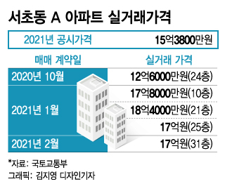 공시가격을 낮춘 이유는 서초구 주장처럼 '실거래가격과의 역전' 때문은 아니다. 수정된 공시가격 역시 지난해 실거래가격 12억6000만원보다 높다. 특히 해당 아파트는 작년 10월 실거래 이후 5억원 가까이 올라 일각에선 작년 실거래 가격이 '이상거래'일 가능성이 제기됐다. 이 매매계약은 계약 후 6개월이 지났는데도 등기 이전이 안된 상태였다.
