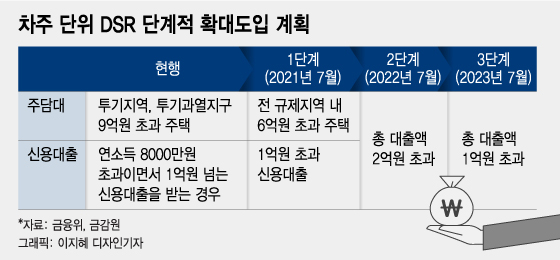 정부는 최근 '가계부채 관리방안'을 통해 오는 7월부터 모든 규제지역에서 6억원 초과 주택 주택담보대출에 차주 단위의 DSR(총부채원리금상환비율)을 적용한다고 밝혔다. 이 규제가 작동하면 원리금이 소득의 40%를 넘으면 대출을 받을 수 없게 된다.