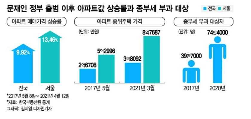 문 대통령은 지난 2019년 초 신년 간담회에서 "집값 원상 복귀"을 약속했다. 하지만 지난 4년간 서울 집값이 10% 넘게 올랐고 지금도 상승세가 꺾이지 않고 있다. 이 기간 서울 아파트 중위값은 3억8092만원에서 지난 3월 기준 8억7687억원으로 4년간 2배 넘게 올랐다. 민간 통계인 KB부동산 기준으론 서울집값이 34.9% 올라 정부통계 보다 2배가 넘는다.
