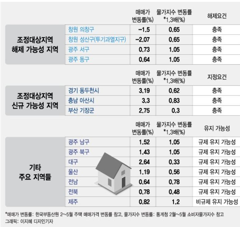 정부가 내일(30일) 규제지역 신규지정과 해제를 위한 주거정책심의위원회(주정심)를 개최한다. 지난해 하반기 규제지역 지정 이후 집값 상승률이 꺾였거나 하락한 광주와 창원 일부 지역이 규제지역에서 빠질 가능성이 높은 것으로 전해졌다. 교통호재 등으로 집값이 크게 오른 경기도 동두천이나 충남 아산, 부산 기장 등은 조정대상지역으로 신규 지정될 가능성이 높다.