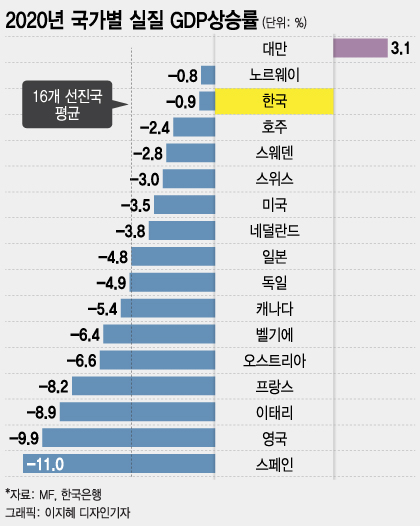 4일 한국은행 등에 따르면 코로나19 위기가 정점이었던 지난해 한국의 실질 GDP성장률은 -0.9%를 기록해 16개 주요국 선진국 평균 -4.7% 대비 선방했다. 순위로는 대만, 노르웨이에 이어 3위였다. 초저금리 기조를 유지하면서 유동성을 확대하는 방법으로 경기를 부양한 결과로 풀이됐다.