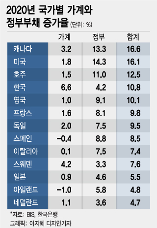 그런데 세계 최상위 경제성장률의 속살을 들여다보면 비결은 '가계 빚'이었다. 지난해 한국 '정부+가계' 부채 증가율은 10.8%로 캐나다, 미국, 호주에 이어 4번째로 높았다. 다른 국가들이 정부 부채를 늘리는 식으로 경기 방어를 해 왔다면 한국은 가계부채에 의존하는 경향이 뚜렷했다. 부채가 가장 많이 늘어난 캐나다의 경우 가계부채가 3.2%, 정부부채가 13.3% 각각 늘어난 반면 우리는 정부 부채가 4.2% 늘어난 사이 가계부채는 이보다 많은 6.6% 증가했다. 주요국 가운데 가계부채 증가율은 1위다.