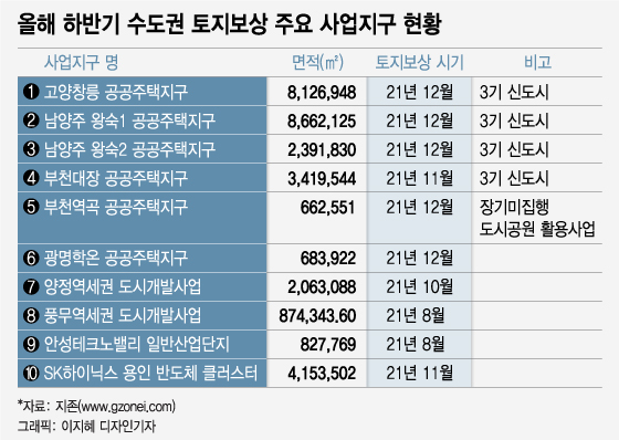 산업단지에서 중에서는 'SK하이닉스 용인 반도체 클러스터 조성사업'(415만 3502㎡)의 보상 규모가 가장 크다. 이달 중 감정평가사 선정을 마무리한 후 감정평가를 거쳐 오는 11월부터 본격적인 협의 보상을 시작한다.