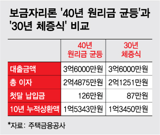 그런데 한국주택금융공사는 이번에 추가된 40년 만기 상품 이용시에는 체증식 분할상환이 불가능하다고 안내하고 있다. 40년을 만기로 한다면 원금균등 상환, 원리금 균등상환 2가지 중 선택해야 한다. 둘 중 선호도가 높은 건 원리금 균등상환이지만 이것 역시 '30년 체증식 분할상환'과 비교하면 불리한 구조다. 30년 체증식이 총 이자액은 물론 초기 월상환액도 더 적다.