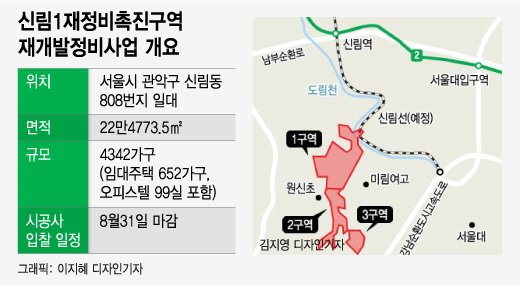신림1구역은 서울시 관악구 신림동 808번지 일대 면적 22만4773㎡에 4342가구 규모의 공동주택을 짓는 사업이다. 여기에는 임대주택 652가구와 오피스텔 99실도 포함돼 있다. 예정 공사비는 1조537억원에 달한다.
