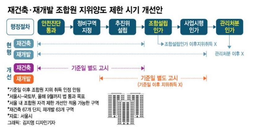개정안은 국토부가 아닌 오세훈 시장이 적극 추진했다는 점에서 시장의 기대와 관심을 받았다. 서울 도심내 재건축 사업 진도를 빼면서 투기수요를 조기 차단할 수 있는 장치로 토지거래허가구역 확대에 이어 오세훈표 '투기방지책'으로 꼽혔기 때문이다. 조합원 지위 양도 제한 시기가 당겨지면 실거주 목적이 아니라 시세차익만 노린 아파트 매매를 차단할 수 있다. 확실한 투기방지책이 2개나 작동하는 셈이라 재건축을 막아왔던 국토부도 오 시장과 합의해 추진키로 합의했다.
