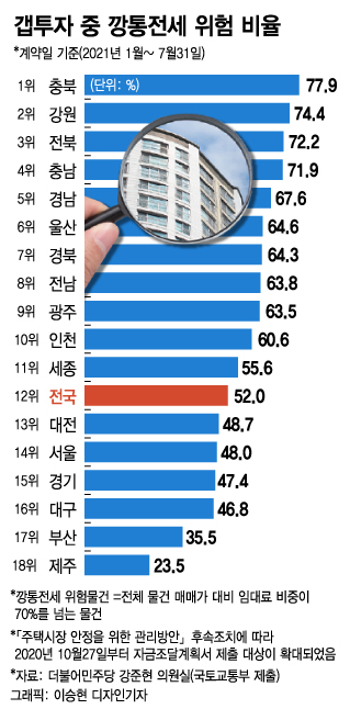 부산도 지난해 16.9%에서 올해 35.5%로 두 배가량 높아졌고 대구도 29.9%에서 46.8%로 비중이 올라갔다. 울산(64.6%)과 세종(55.6%)은 올해 갭투자의 절반 이상이 깡통전세 위험에 노출된 거래였다.