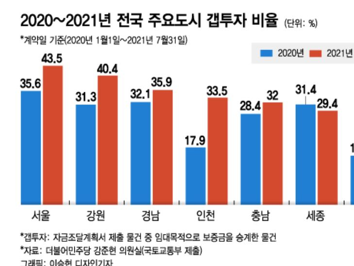 8만4130건의 거래 중 3만6555건은 기존 세입자의 임대보증금을 승계한 거래였다. 43.5%가 갭투자였다는 의미다. 서울의 갭투자 비율은 2018년 38.9%, 2019년 36.4%, 2020년 35.6%로 3년 연속 30%대를 유지해 왔지만 올 들어 40%대를 넘어섰다.