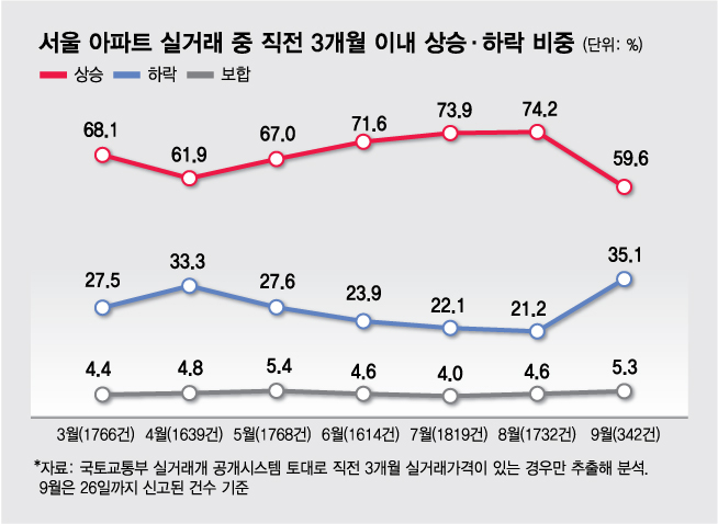 30일 머니투데이가 국토교통부 실거래가 공개시스템에 올라온 9월(1일~26일) 아파트 실거래 신고건을 전수 분석한 결과, 직전 거래 가격 대비 가격을 낮춘 하락 거래 비중이 35.1%에 달하는 것으로 조사됐다. 직전 3개월 안에 같은 단지에서 거래가 있어 비교가 가능한 실거래 총 342건 가운데 120건이 가격을 낮춰 성사된 것이다.