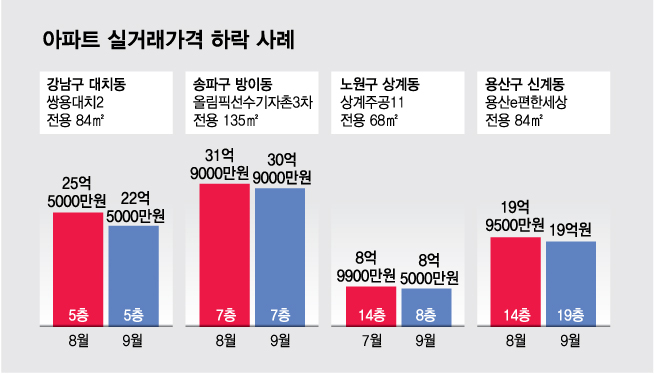 송파구 방이동 '올림픽선수기자촌3차' 전용 135㎡는 지난 16일 30억9000만원(7층)에 실거래됐다. 이 아파트 같은 면적 7층이 지난 8월 31억9000만원에 거래 됐는데 1개월 여 만에 1억원 내린 것이다. 재건축 단지가 밀집해 가격 상승폭이 가장 컸던 노원구 상계동도 하락 거래가 나왔다. 상계주공11 전용 68㎡는 지난 7월 8억9900만원(14층)에 거래됐으나 이달 24일에는 8억5000만원(8층)에 거래돼 4900만원이 떨어졌다. 용산구 신계동 '용산e편한세상' 전용 84㎡는 지난달 19억95000만원(14층)에서 이달 7일 19억원(19층)으로 9500만원 가량 가격이 낮아졌다.