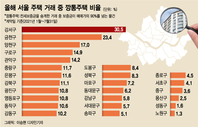 30일 강준현 더불어민주당 의원실을 통해 국토교통부로부터 올해(1월~7월말) 주택거래 자금조달계획서 제출현황을 제출받아 분석한 결과 서울시에서 이뤄진 8만4130건의 거래 중 깡통주택 거래 비율이 가장 높은 곳은 강서구였다.