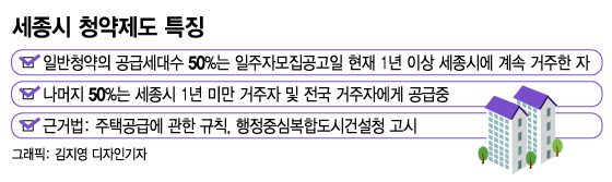 세종이 아닌 다른 지역 아파트 청약에서는 무조건 해당지역 거주민에 100% 우선 배정 한다. 세종만 '전국구'로 청약 기회를 열어둔 이유는 행복청이 세종시를 설계할 당시 인구 50만명을 목표로 했기 때문이다. 외지인의 인구 유입을 유도하기 위해 이같은 청약제도를 유지해온 것이다. 현재 세종시 인구는 27만5000명으로 목표에는 한참 미달한다.