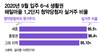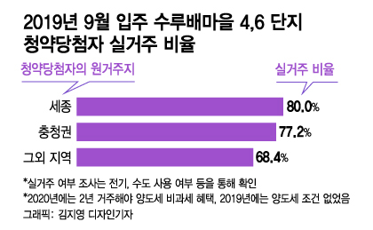 특히 양도세 비과세를 받기 위해 2년 의무거주해야 하는 규제를 적용받기 전인 2019년 9월 입주 아파트에도 타지역 당첨자의 세종시 거주율이 높았다. 2019년 9월 입주한 수루배마을 4·6 단지 청약당첨자 중 충청권과 그외 지역 출신의 실거주 비율이 각각 77.2%, 68.4%였다. 세종 시민의 80%와 큰 차이가 없었다.