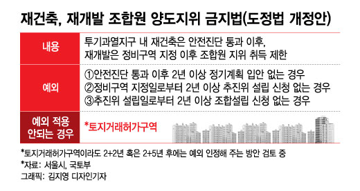 정부와 서울시는 지난 6월 투기 수요를 차단하면서 재건축 속도를 내기 위해 안전진단을 통과한 재건축 단지의 조합원 지위 양도를 금지하는 강력한 투기 방지책을 내놨다. 하지만 "재산권 침해"라는 반발에 따라 토지거래허가구역에 대한 규제를 원안보다 완화하는 방안을 검토 중인 것으로 전해졌다.