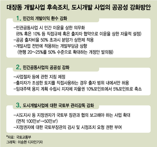 대장동 개발사업처럼 민관 공동 출자로 시행하는 도시개발사업에서 특정 민간 출자자가 과도하게 이익을 독점하지 못하도록 민간 출자자 간에도 수익배분 기준이 새롭게 도입된다.