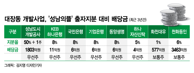 실제로 민간 출자 비중이 50%였던 대장동 개발사업의 경우 김만배 씨를 비롯한 특정 출자자가 전체 이익의 대부분을 가져갔다. 민간의 이익독점' 이슈가 불거진 결정적인 이유다. 민간출자자 가운데 KEB하나은행의 경우 전체 지분이 14%(우선주)였지만 최근 3년간 배당금은 11억원에 그쳤다. 전체 배당금 5903억원의 약 1.86%만 수익으로 배분받은 것이다.