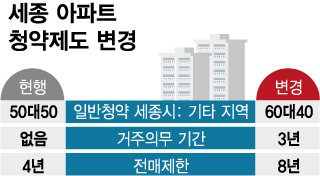 앞으로 세종시 아파트 청약에는 3년 실거주 의무와 8년 전매제한이 적용될 것으로 보인다. 수도권에만 적용되던 실거주 의무가 세종에도 첫 도입되며 전매제한은 종전 4년 대비 2배 강화되는 것이다. 아울러 일반청약은 세종시민과 기타 전국지역 배정 물량이 60대 40 비율로 바뀐다. 기타 전국지역 비중이 현행 50%에서 40%로 소폭 줄지만 여전히 '전국구 청약'이 가능한 유일한 지역으로 남는다.