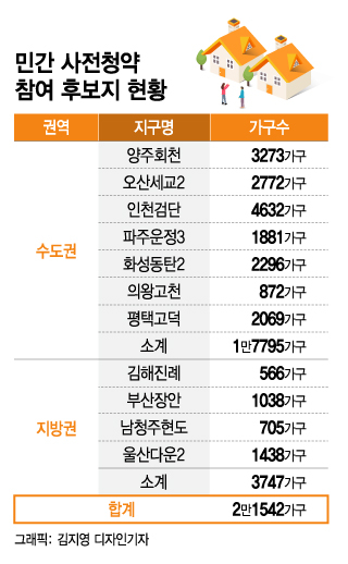 민간 사전청약 물량은 민간에 이미 매각된 공공택지에서 우선적으로 나온다. 택지를 매입한 건설사가 사전청약으로 공급하는 데 동의한 물량이다. 앞서 국토부는 기매각택지 중 사전청약 참여 후보지로 수도권 1만7795가구, 지방권 3747가구 등 2만1542가구를 제시한 바 있다. 수도권에서는 △양주회천 △오산세교2 △인천검단 △파주운정3 △화성동탄2 △의왕고천 △평택고덕, 지방권에서는 △김해진례 △부산장안 △남청주현도 △울산다운2 등이 포함됐다.