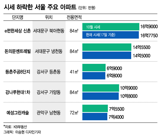 'e편한세상 신촌' 등 올해 급등했던 서울 일부 아파트 시세가 최근 하락한 것으로 나타났다. 서대문구, 강서구, 관악구 등에서 시세 하락 단지가 나왔고 일부는 지난달 대비 2000만원까지 내린 것으로 확인됐다. 시세는 대출 기준으로 활용되는 지표여서 실수요자들에게도 타격이 있을 것으로 보인다.