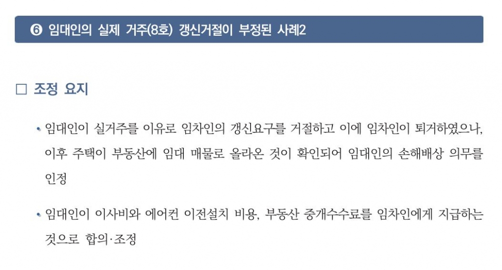그 중에서도 특히 계약갱신요구권 관련 분쟁 조정사례 가운데 하나가 집주인들의 이목을 끌었다. 집주인이 실거주를 이유로 세입자의 갱신요구를 거절해 세입자가 퇴거했으나 이후 집이 부동산에 임대매물로 올라온 것이 확인된 사례다.