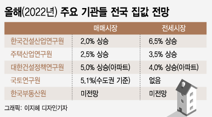 올해 집값 전망은 더 엇갈린다. 지난해 하반기부터 상승속도가 둔화하고 일부 지역에서 하락반전 사례가 나오고 있는 변곡점이기 때문이다. 작년말 전망치를 내놓은 한국건설산업연구원과 주택산업 연구원은 각각 2.0%, 2.5% 상승으로 전망했다. 대한건설정책연구원은 아파트 기준 5.0% 상승으로 봤다. 정부 산하 기관인 국토연구원은 일찌감치 수도권 기준으로 5.1% 상승 전망을 내놨다.