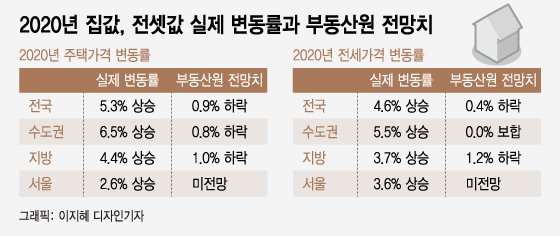 부동산원은 지난 2015년 이후 매년 1월 중순경 해당 연도의 연간 주택가격과 전세가격 전망치를 발표했다. 그러다 집값이 급등한 지난해 연초에 돌연 "코로나19 변수가 생겼다"는 이유로 전망치를 발표하지 않고 건너 뛰어 국정감사에서 질타를 받았다. 올해는 특히 정부와 민간기관의 집값 전망이 크게 엇갈리고 있는 상황이어서 정부 산하 기관의 집값 전망치에 관심이 모아졌다. 부동산원은 정부가 공인하는 유일한 부동산 통계 담당 기관이기 때문이다.