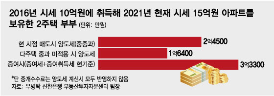 매도하지 않고 부부간 증여를 선택한다면 증여세·증여취득세(8%)를 합쳐 3억3300만원의 세금을 내야 한다. 일반세율을 적용한 양도세보다 1억6900만원 더 부담해야 하지만 많은 이들이 증여를 택했다. 이유는 세금보다 집값 상승 기대이 더 크기 때문이다. 특히 부부간 증여는 증여후 5년이 지나면 증여 시점 집값을 취득가액으로 인정해 주기 때문에 양도세 부담을 더 낮출 수 있다. 2016년 취득가격이 10억원이지만 증여시점 가격이 15억원이고 이후 2026년 20억원이 됐다면 차익은 10억원이 아닌 5억원으로 간주한다는 뜻이다. 또 6억원 미만 주택 증여는 증여세 부과 대상도 아니다.