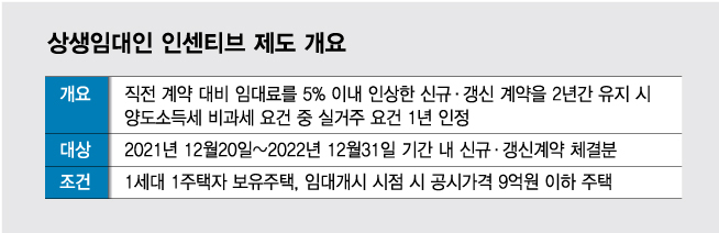 상생임대인 제도는 신규나 갱신 계약 시 임대료를 '직전 계약' 대비 5% 이내 인상(유지·인하 포함)한 임대인이 해당 계약을 2년 간 유지하면 양도소득세 비과세 특례 적용을 위한 실거주 요건 2년 중 1년을 충족한 것으로 인정해주는 제도다. 임대차3법 이후 급등한 전셋값을 안정시키기 위해 마련됐다.