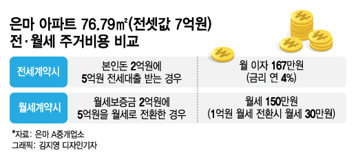 은마 아파트에서 전세금 1억원을 월세계약으로 전환시 월세는 30만원 수준으로 가격이 형성돼 있다. 만약 전용 76.79㎡에 전셋값 7억원짜리 전세계약을 보증금 2억원에 월세를 낀 반전세로 바꾼다면 월세는 150만원이다. 이 세입자가 보증금 5억원을 월세 전환하지 않고 연 4%의 전세대출을 받는다면 연간 2000만원, 월 167만원의 이자를 은행에 갚아야 한다. 은마 중계업소 관계자는 "은행 대출 이자보다 월세가 낮은 데다 대출을 받는 절차도 까다롭다보니 세입자들이 그냥 월세로 전환하려 한다"고 말했다.